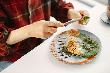 Pretty cute woman sitting in cafe eat cake. Breakfast in the cafe. A girl is sitting at a table in a cafe.