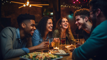 Group of young people having dinner together in a restaurant. They are talking and laughing.