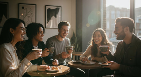 A group of five friends enjoying coffee and pastries in a cozy cafe, laughing and chatting, with sunlight streaming through the window