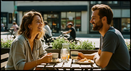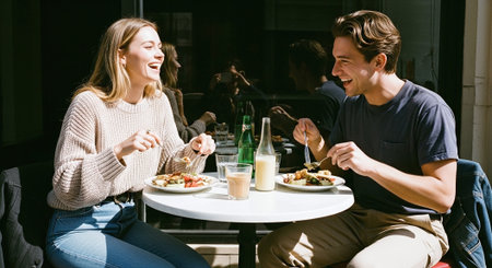 A young couple enjoying a meal together at a small table in a cafe, laughing and sharing a joyful moment, with plates of food and drinks on the table