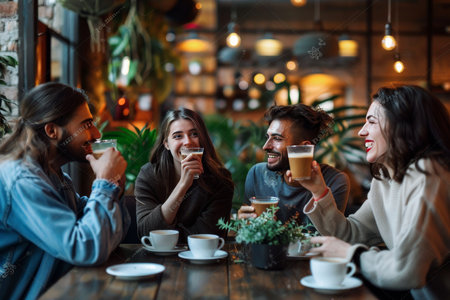 Diverse group of friends enjoying coffee and engaging in lively conversation at a cozy restaurant