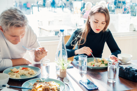 Young female and male friends sitting at served table in casual cafe and eating delicious hot risotto with shrimps or curry rice during lunch break. Trying new foods while traveling. real people.