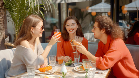 Group of friends having dinner together at outdoor restaurant, drinking orange juice