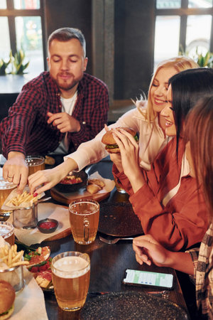 Sitting and resting. Group of young friends together in bar with beer.