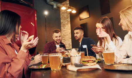 Weekend time spending. Group of young friends sitting together in bar with beer.