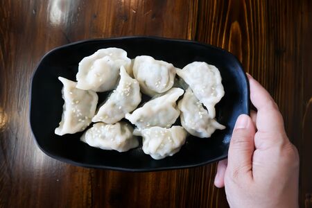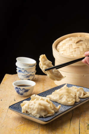 Eating fresh, delicious boiled dumplings, jiaozi on wooden table background with soy sauce