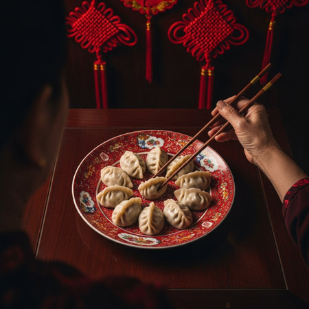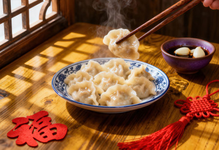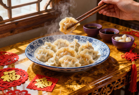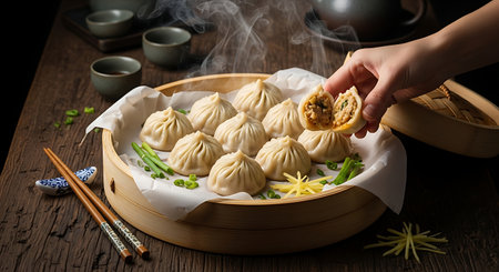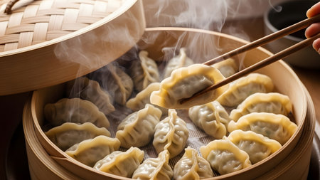 Enjoy a mouthwatering view of steaming dumplings being served with chopsticks, capturing the essence of a warm and inviting dining scene in traditional Asian cuisine.