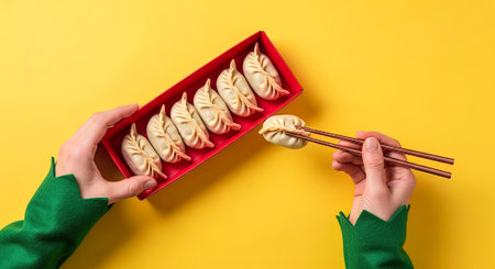 Craving delicious dumplings tonight? Enjoying fresh, savory Asian cuisine with chopsticks on yellow surface