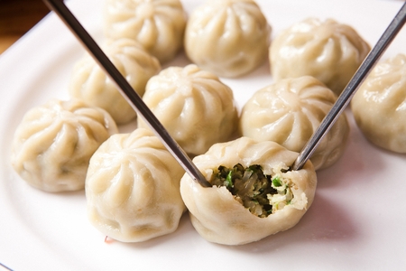 Chinese steamed dumpling in Bamboo Steamer, commonly eaten in East Asia in Beijing, China