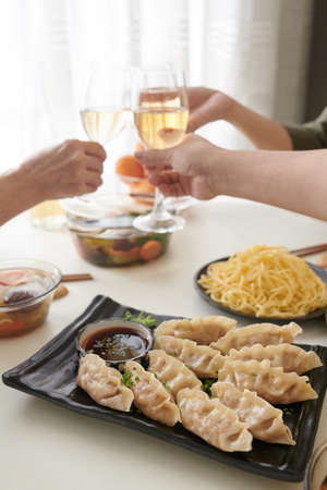 Plate with delicious homemade jiaozi and soy sauce on dinner table, guests toasting with wine glasses in background