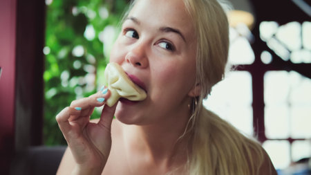 A beautiful blonde woman eats hot khinkali with her hands in a restaurant of traditional Georgian cuisine. Close-up. Khinkali is a national dish of Georgian cuisine