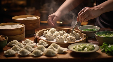 A bamboo steamer filled with steaming dumplings sits invitingly on a dining table, complemented by sauces and a warm ambiance, reflecting culinary artistry.