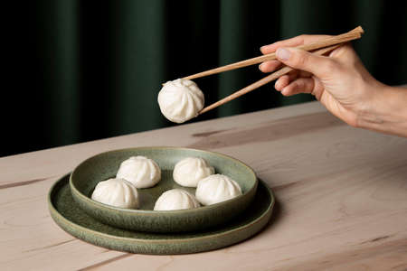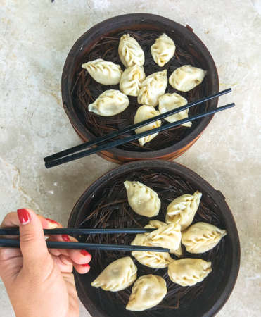Woman holding chopsticks, Chinese dumplings in a steam basket, closeup dim sum flat lay on the marble table, traditional Chinese cuisine