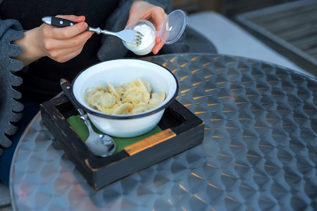 Meat dumplings russian pelmeni with pepper and sour cream in bowl