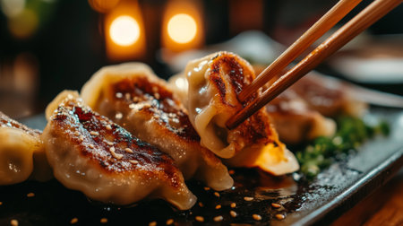Savor a plate of delicious dumplings, perfectly grilled and served with chopsticks. The inviting presentation and vibrant flavors make this dish irresistible.