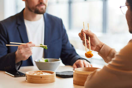Closeup of businessman enjoying Asian food during business lunch with colleague at cafe, copy space