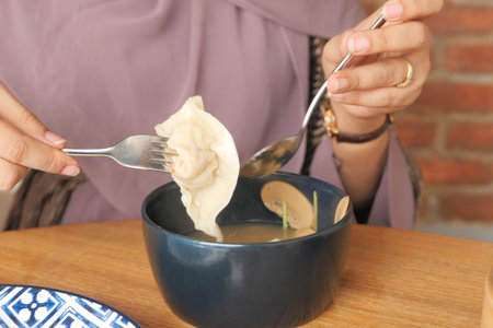 Man enjoying steamed dumplings, helping himself with a spoon. Great for cooking and lifestyle concepts.
