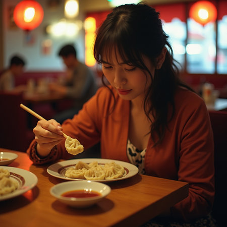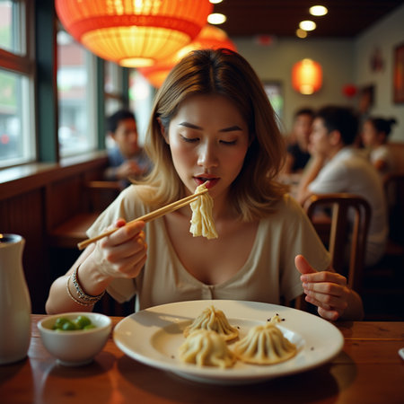 Asian woman eating dumpling with chopsticks in a restaurant.