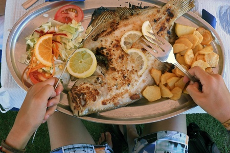 Girl eating fish for a lunch in the restaurant