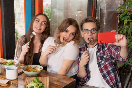 Group of friends having lunch together in a cafe. Group of people sitting at the table and smiling