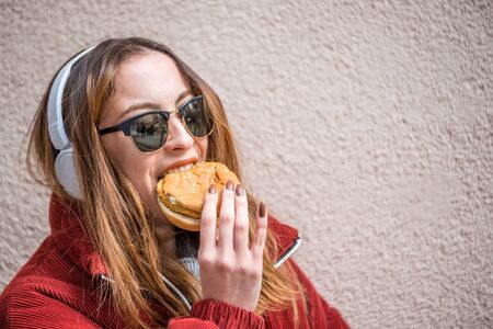 Beautiful young cute girl in fashionable clothes enjoys fast food hamburger while standing in front of a wall