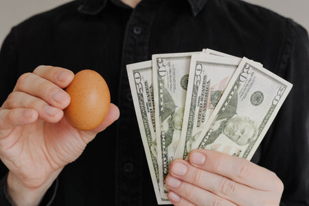 Egg and dollar banknotes in a mans hand. Egg crisis in USA. High prices for eggs concept.