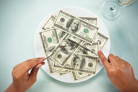 People hand eating the dollar bills on the plate