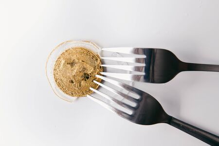 Bitcoins and fork in plate over white background