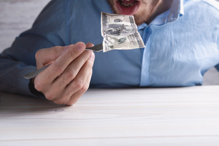 Dollars on a plate. Man tries to eat dollar bills with cutlery.