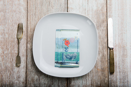 A close up view of One and Two Hundred Rand notes on a plate with a knife and fork apart to show the vaule and price of food