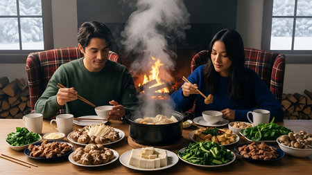 A couple enjoys a steaming hot pot meal with fresh ingredients by a cozy fireplace on a snowy winter night, creating a warm and comforting dining.