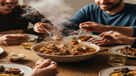A closeup of a steaming pot of stew, showcasing rich colors and fresh ingredients. The vibrant spices being lifted by a spoon evoke a sense of warmth and flavor. Perfect for culinary themes.