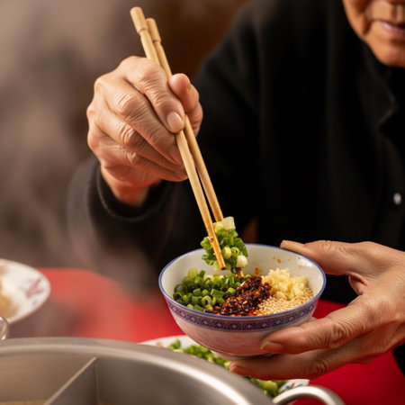 Woman hands using chopsticks and spoon while eating hotpot
