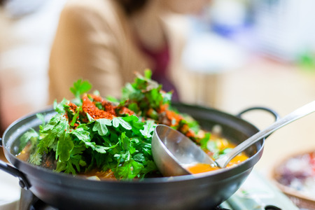 Korean hot pot meal. Hands taking food with chopsticks.