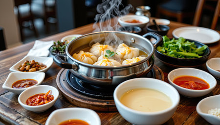 A flavorful scene featuring steaming dumplings in a metal pot with a variety of condiments and fresh greens, perfect for food enthusiasts.
