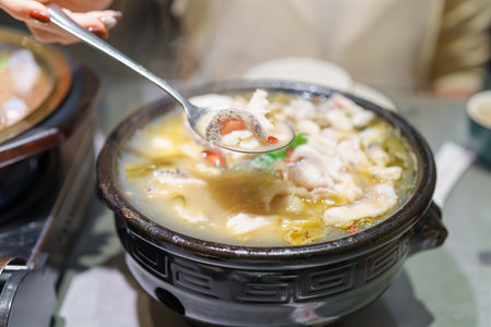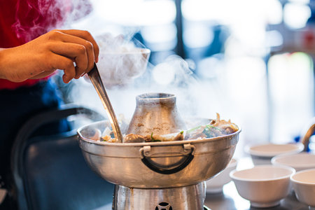 Jim Joom, Thai style of hot pot from the Northeast of Thailand contains pork, vegetable and glass noodle in clay bowl