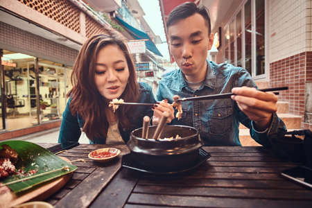 Happy young chinese couple sitting at cafe outside enjoying traditional asian food. Widescreen shooting.