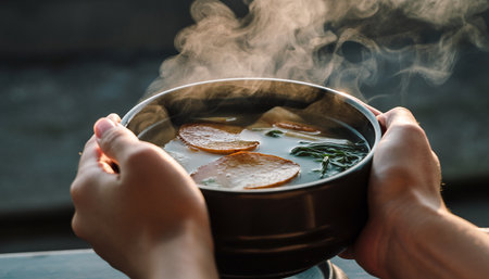 A close-up of a steaming dish of hot soup, with aromatic smoke rising and adding to the appetizing scene