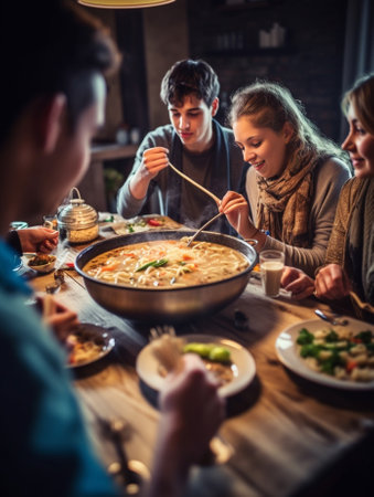 Generative AI : Happy group of friends eating pasta at home dinner party Cheerful young people having lunch break together Life style concept with guys and girls celebrating than