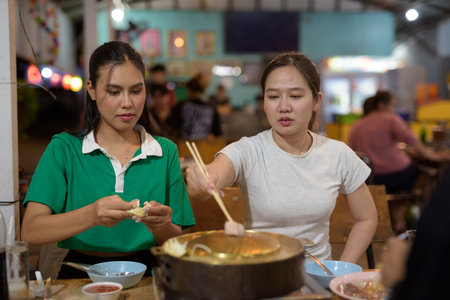 Friends eating Thai Food BBQ Grill Mu Kratha at night