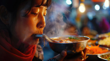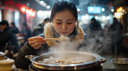 A female traveler takes a bite of mala hot pot in a bustling Chongqing restaurant, the steam and aroma of the spices filling the air, capturing the joy of discovery
