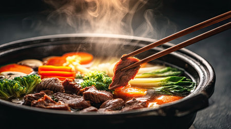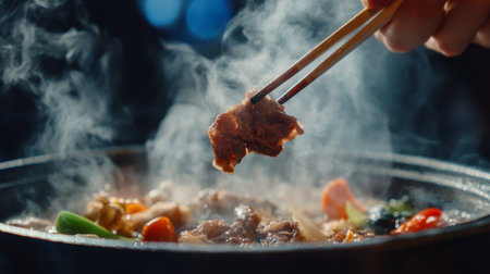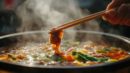 A hand holding chopsticks lifts tender meat from a steaming hot pot filled with fresh vegetables and fragrant broth, showcasing the joy of communal dining and rich flavors.