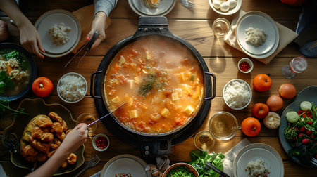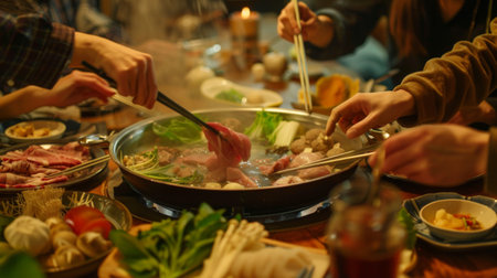 Laughter & Ladles: A steaming pot of broth takes center stage, surrounded by colorful ingredients and eager chopsticks - a hot pot gathering ready to simmer memories and laughter. AI-generated