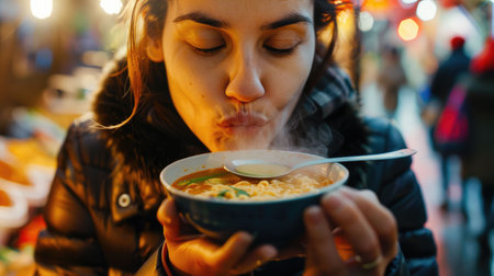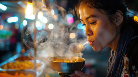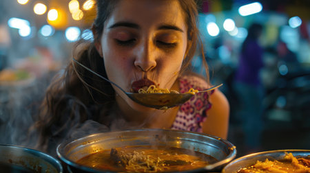 A woman is enjoying a bowl of staple food with a spoon, indulging in her food craving. She is savoring the dish made from a delicious recipe and sharing it with delight AIG50