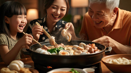 A family enjoying a seafood hot pot meal, laughing and using chopsticks to dip ingredients into the broth