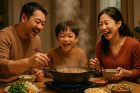 A hot pot meal being enjoyed at a family gathering, with steam rising from the pot, and plates of fresh ingredients and dipping sauces laid out on the table.