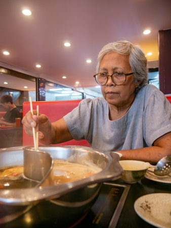 Senior Asian Woman Eating Sukiyaki Hot Pot suki shabu Food with Chopsticks Restaurant Dining