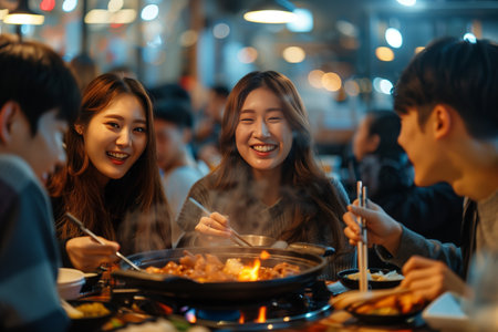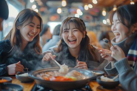 A group of friends enjoying a lively shabu-shabu dinner together, dipping ingredients into a communal pot with smiles and laughter.