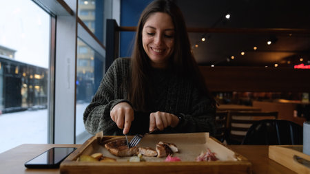 Pretty brunette enjoying tasty beef steak in restaurant in winter. Woman in warm cozy sweater eating meat near window. Snow outside
