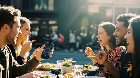 A group of friends enjoying a meal outdoors at a restaurant, smiling and laughing, with various dishes on the table, bright and cheerful atmosphere